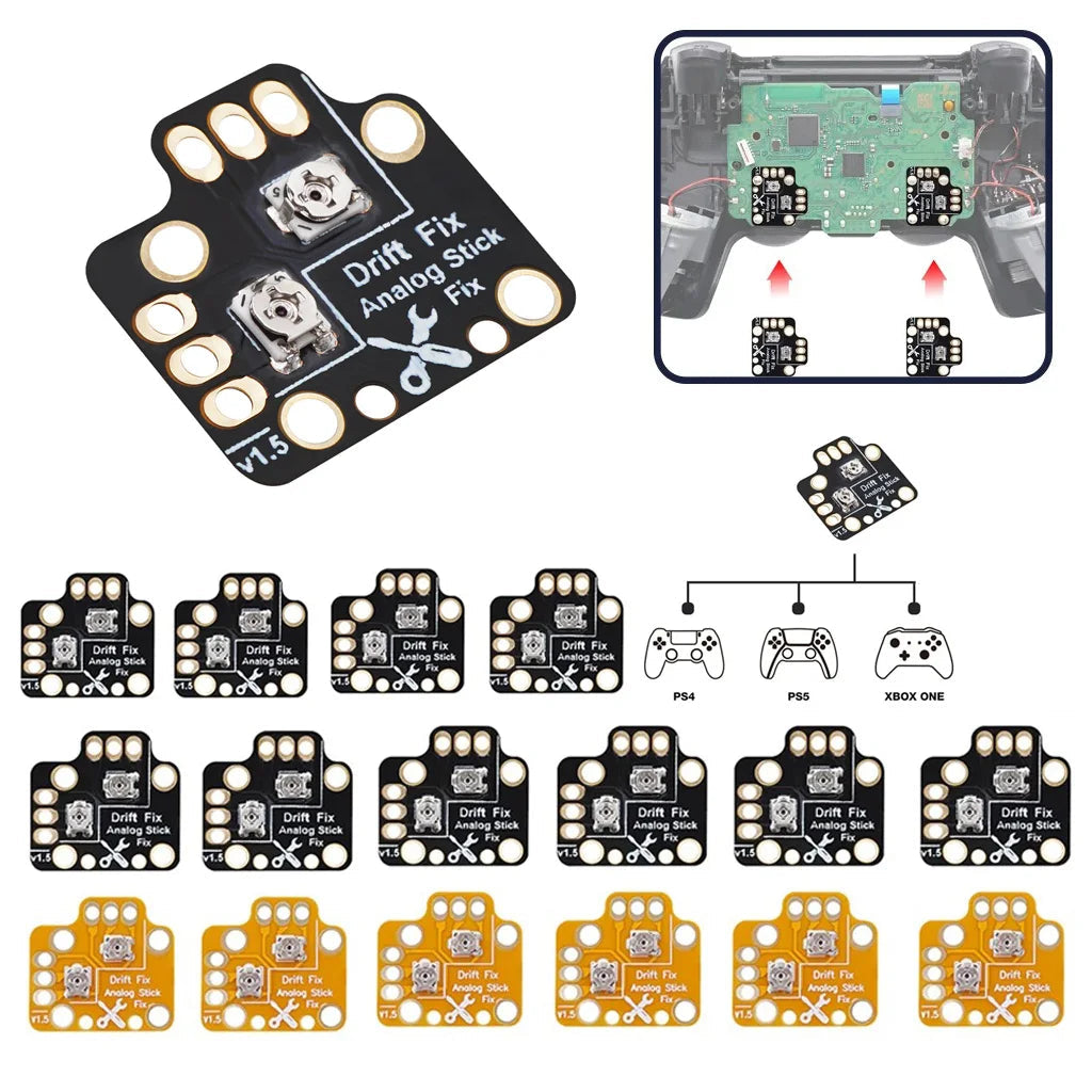 Este dispositivo es un módulo de reparación para el drift de joysticks analógicos diseñado para controles de consolas como PS4, PS5 y Xbox One.