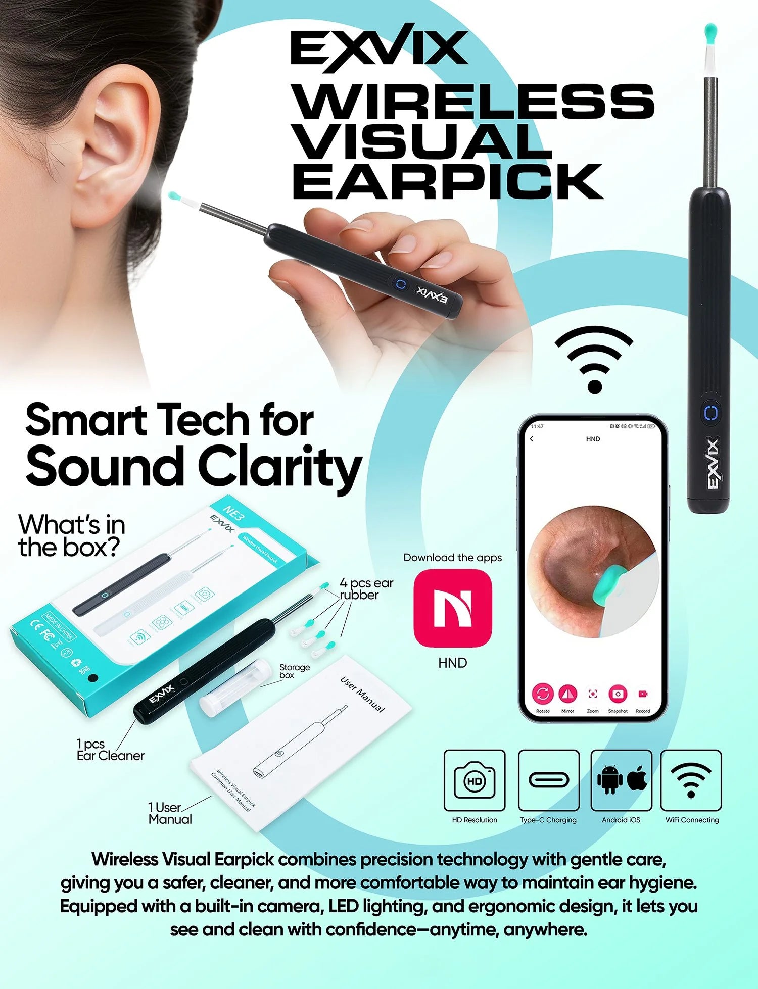 Endoscopio de oído luminoso recargable, herramienta de eliminación de cera de oído, HD, Visual, inalámbrico, inteligente, cuidado de limpieza del oído